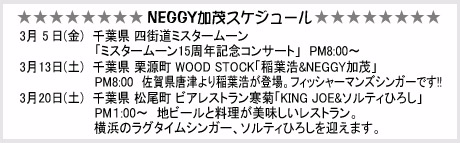 1990年上京。東京を目指すも勢い余って通過してしまい千葉県成田市にて音楽活動開始。以後仕事の傍らミュージシャンとして年間40本以上という驚異的な数のLIVEをこなしている。いわゆる普通のLIVEのみならず、キャンプコンサートなどイベント出演も多数。現在は「KING JOE」というBANDで全国規模で活動中!!その爆笑&失笑ステージは見ごたえあります。「カモネギ」の愛称で親しまれております。