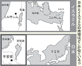 その後、長い年月を経て「平安京」が日本の都となりますが、この地理的要因でさえイスラエルの影響を多大に受けているようです。イスラエルの首都はエルサレムであり、原語の意味は「神の平安」です。それは正に「平安京」と同じ意味です。そして平安京が琵琶湖の西側、日本海と湖の中間に位置していることにも注目です。エルサレムも若干北側ではあるものの、基本的には死海の西側、地中海と湖の中間に位置しています。先日、イスラエルの空港があるテルアビブからレンタカーを借りてエルサレム、および死海までドライブする機会に恵まれました。驚いたことに、地中海そばのテルアビブからエルサレムまではさほど距離はないのにもかかわらず、山々の連続だったのです。それらの山を越えてエルサレムに辿り着き、そこからもう少々ドライブを続けると死海が見えてきます。日本海から京都を経て琵琶湖に至る道のりも同じくその途中は山々の連続であり、琵琶湖に至る直前に平安京が開けてくるのです。