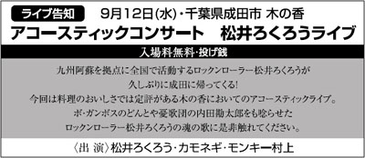 1990年上京。東京を目指すも勢い余って通過してしまい千葉県成田市にて音楽活動開始。以後仕事の傍らミュージシャンとして年間40本以上という驚異的な数のLIVEをこなしている。いわゆる普通のLIVEのみならず、キャンプコンサートなどイベント出演も多数。現在は「KING JOE」というBANDで全国規模で活動中!!その爆笑&失笑ステージは見ごたえあります。「カモネギ」の愛称で親しまれております。