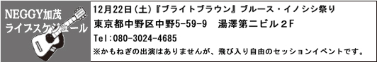 東名阪に限らず全国からブルース好きが集まるブルース・イノシシ祭り。今年最後のイノシシ祭りは12月22日東京都中野区に有るブルースバーブライトブラウンで開催されます。ブルースに興味がある方は必見のイノシシ祭り。次回は12年後ですのでお見逃しなく ! !