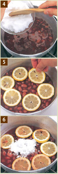 途中で加える水を「びっくり水」といいます。びっくり水をすると、豆の皮と中身が同じように柔らかくなり、皮にしわが寄らず、ふっくらとします。砂糖を一度に入れると、豆の水分が煮汁に出て豆がかたくなるので、2回に分けて加えます。