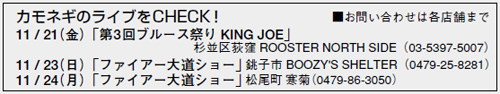 1990年上京。東京を目指すも勢い余って通過してしまい千葉県成田市にて音楽活動開始。以後仕事の傍らミュージシャンとして年間40本以上という驚異的な数のLIVEをこなしている。いわゆる普通のLIVEのみならず、キャンプコンサートなどイベント出演も多数。現在は「KING JOE」というBANDで全国規模で活動中!!その爆笑&失笑ステージは見ごたえあります。「カモネギ」の愛称で親しまれております。