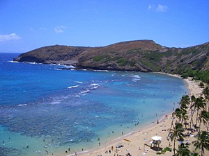 何十年かぶりにハナウマ湾に行ってきました。ハナウマ湾はオアフ島ワイキキビーチから東へ約9㎞、ココヘッドの先にある大きな入江で、絶好のシュノーケリングとダイビングスポットとして人気の高いとても美しい湾です。現在の正式名称は「Hanauma Bay Nature Preserve」。つまりここは自然保護区になっていて、美しい海や自然、そしてここで暮らす多数の海洋生物たちを守る為に、一般のビーチよりも更に厳密な規制が設けられた海洋公園になっています。1961年に撮影されたエルビス・プレスリー主演の「ブルーハワイ」の舞台にもなりましたが、青く澄み切った海、大きく孤を描いて広がる白い砂浜、美しい珊瑚礁、そして波打ち際まで泳いでくる沢山のカラフルな熱帯魚たちと一緒に遊ぶ事が出来るので、年々訪れる人が増え続けました。私もハワイに行き初めた頃は毎回訪れていましたが、いつしかあまりの人の多さに、車から眺めることはあっても、ビーチに降りることはなくなりました。その後、観光客が餌を与えたことにより湾の生態系のバランスが崩れ、大きな魚が増えてしまったり、水質汚染が進み、さらに珊瑚が死んでしまうなどの問題が出てきたため、自然環境を保持するためにハナウマ湾に入れなくなった時期がありました。その後、有料化(入園料:13歳以上5ドル)され、休園日が設けられるようになりました。また施設も整えられ、ビーチに降りる前に環境保護と海の安全に関するビデオを観ることが義務付けられました。このビデオは、ワイヤレスレシーバーを通じて日本語をはじめ中国語、韓国語、ハワイ語など8ヵ国語で聴くことができます。ビデオの製作に25万ドル(約2,500万円)をかけたというだけあり、音楽はハワイの人気アーティストを起用し、ハナウマ湾の生い立ちから説明するなど、迫力ある映像になっています。