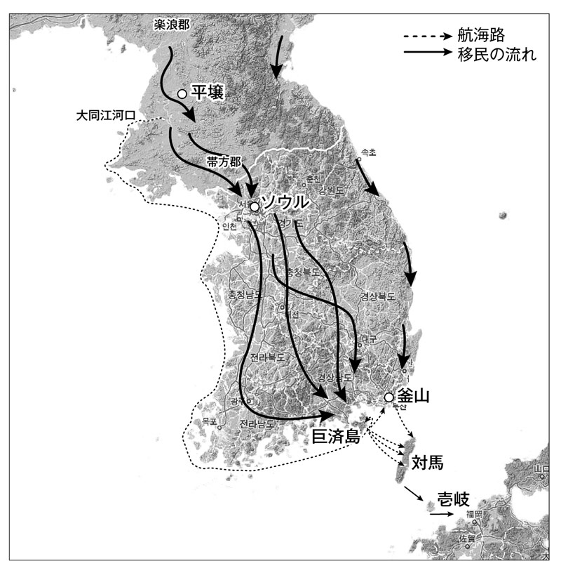 まず、古代朝鮮半島における移民の流れを振り返ると、朝鮮半島の古代史は東アジアからの移民の歴史であると言っても過言でないほど、移民の影響を強く受けています。中国、東アジアから押し寄せる移民の波は、主に朝鮮湾沿いの陸海を通じて半島の北西部から流入し、多くの村や都市が徐々に南に向かって構築されましたが、山岳地帯が多い朝鮮半島の東部は、居住には適切な地域が少なく、敬遠されがちでした。それでも東アジアの極東北部から東海岸沿いに南下してくる移民も徐々に増加し、東アジアからの移民の波は、朝鮮半島の最南端にまで押し寄せてきたのです。そして史書にも記されているとおり、この移民の多くは、倭国への玄関ともいえる狗邪韓国を通過点として、そこから対馬、壱岐、そして日本列島へと旅を続けたのです。