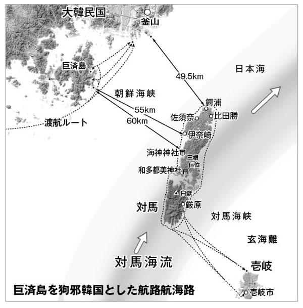倭国に向かう民を乗せた船が、朝鮮半島の最南端を経由して狗邪韓国の港に一旦着岸し、そこから対馬へ航海したという史実に基づいて地図を検証すると、釜山から対馬北部へV字型に逆戻りするよりも、その手前に浮かぶ巨済島(コジェド)東側の沿岸から対馬の西海岸中心部を目指した方が、圧倒的に有利であることがわかります。巨済島の東岸には複数の小さな入江と岬がありますが、東南方向に向いた大きな岬の先端から対馬の伊奈崎までの距離は55km、海神神社までは60kmであり、釜山から対馬の最短距離と大差が無いだけでなく、巨済島から釜山方向への航海ルートもまったく距離の無駄がない絶好のロケーションと言えます。また、当初から対馬の中心部が着岸する港となるため、島の最北端からそこまで南下する必要が無くなります。しかも対馬海流に流されたとしても、島の海岸線が目的地の北部に暫く続くので安心です。