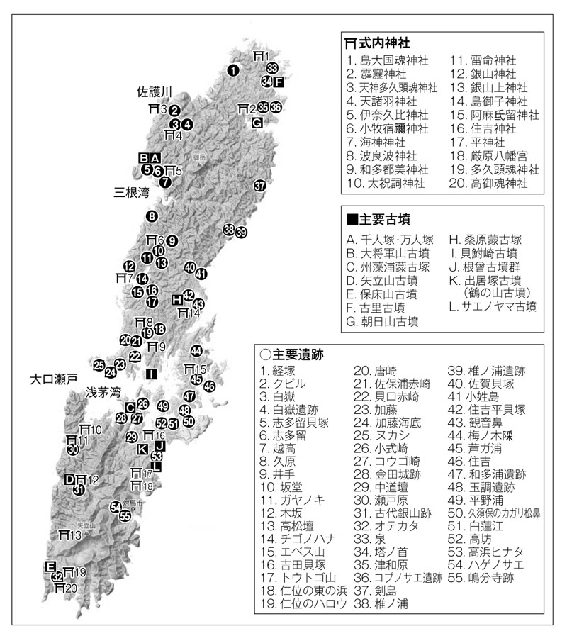 対馬における主要遺跡・主要古墳・式内神社その証拠が対馬に残る多くの古墳や遺跡の存在です。対馬では縄文早期から弥生時代、古墳時代に至るまでのさまざまな遺跡や古墳が発掘されています。それら縄文や弥生遺跡の大半が対馬の中央、西海岸の大口瀬戸から入る浅茅湾沿いの入江、そしてその北に隣接する三根湾周辺で見つかっています。しかし対馬の南部には遺跡がほとんどなく、北部も佐須奈の西、佐護川沿いの数件以外は過疎です。また、縄文、弥生遺跡よりも後世の建造物である式内神社や古墳についても、同様に島の中央部の入江に集中していますが、神社はやや広がりを見せ、島の周辺をおよそ網羅しています。いずれにしても、圧倒的多数の遺跡や古墳が島の中央、西海岸沿いに集中していることから、古代においては朝鮮半島から到来した民が、対馬の西海岸沿いを中心に南北に行き来していいたことがわかります。対馬は地理的に朝鮮の方が近距離に位置することから、まず、島の西側から古代渡来人の影響をより多く受けたのでしょう。そして時代が経つにつれ、徐々に東海岸にも神社や古墳が作られるようになったと考えられます。これらの遺跡や古墳データ、そして地理的状況から察するに、古代の対馬港は島の中央、西海岸周辺にあったのではないかと想定されます。
