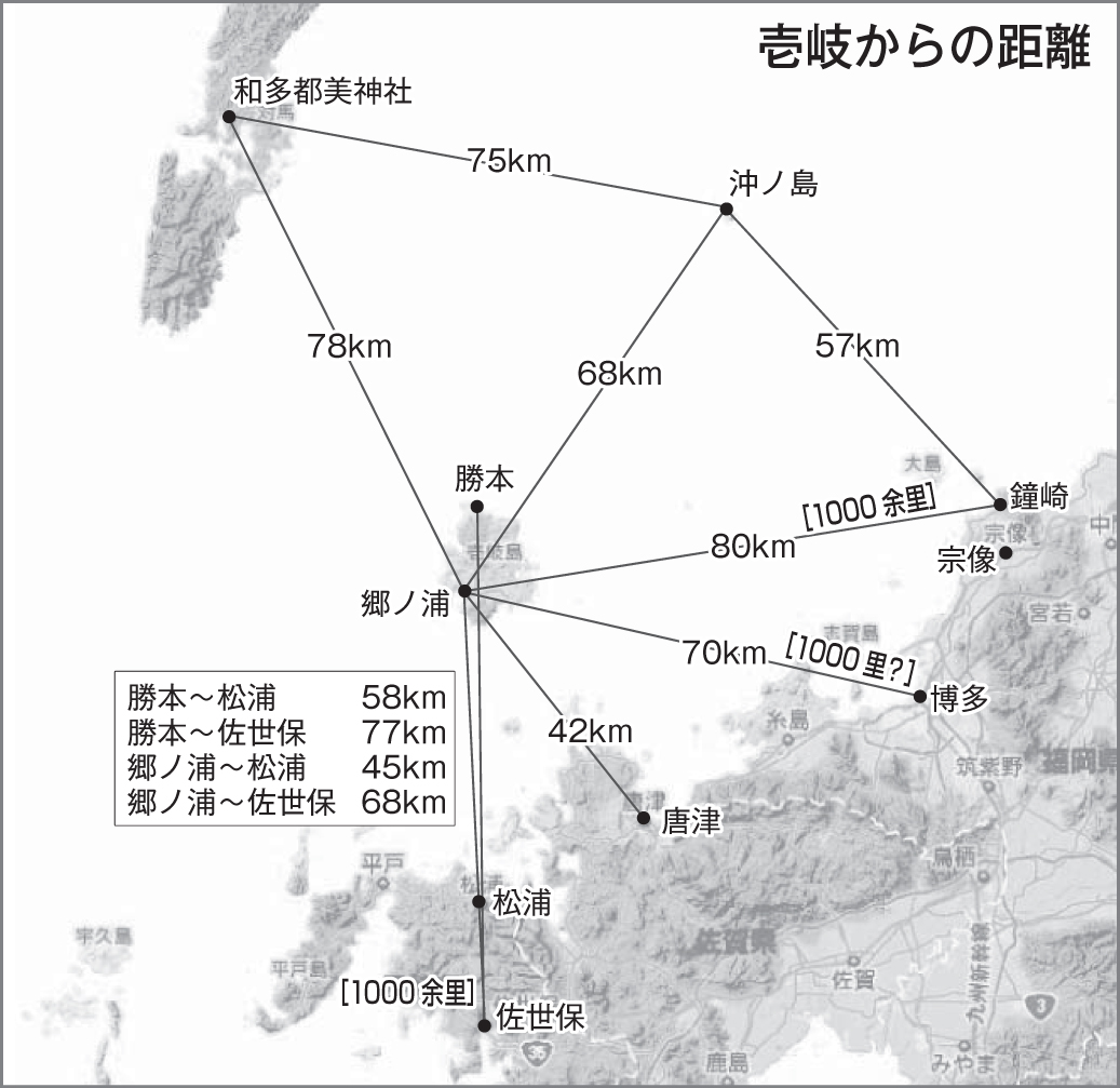では、壱岐から1000余里、70~78kmほどの距離にあたる港町とは、九州のどの地域が該当するのでしょうか。もし、壱岐から松浦の方角、すなわち南方へ向かって1000余里離れている港に航海し続けるとするならば、長崎の南沿岸にある佐世保周辺まで旅することになります。では、壱岐から東南の方向に航海するならばどうでしょうか?勝本から唐津までは51kmであり、1000余里には及びませんが、博多までは70kmあることから、1000余里の範疇にかろうじて入るかもしれません。また、東南東の鐘崎までは80kmあるため、問題なく1000余里と解釈することができます。つまり、史書の1000余里というデータを活かすならば、壱岐から南に向かって佐世保方面に向かうか、それとも東南の博多、もしくは東南東の鐘崎に向かうしか、方法はないようです。いずれにしても、佐賀の松浦では、どうしても説明がつかないのが、「1000余里」の記述なのです。
