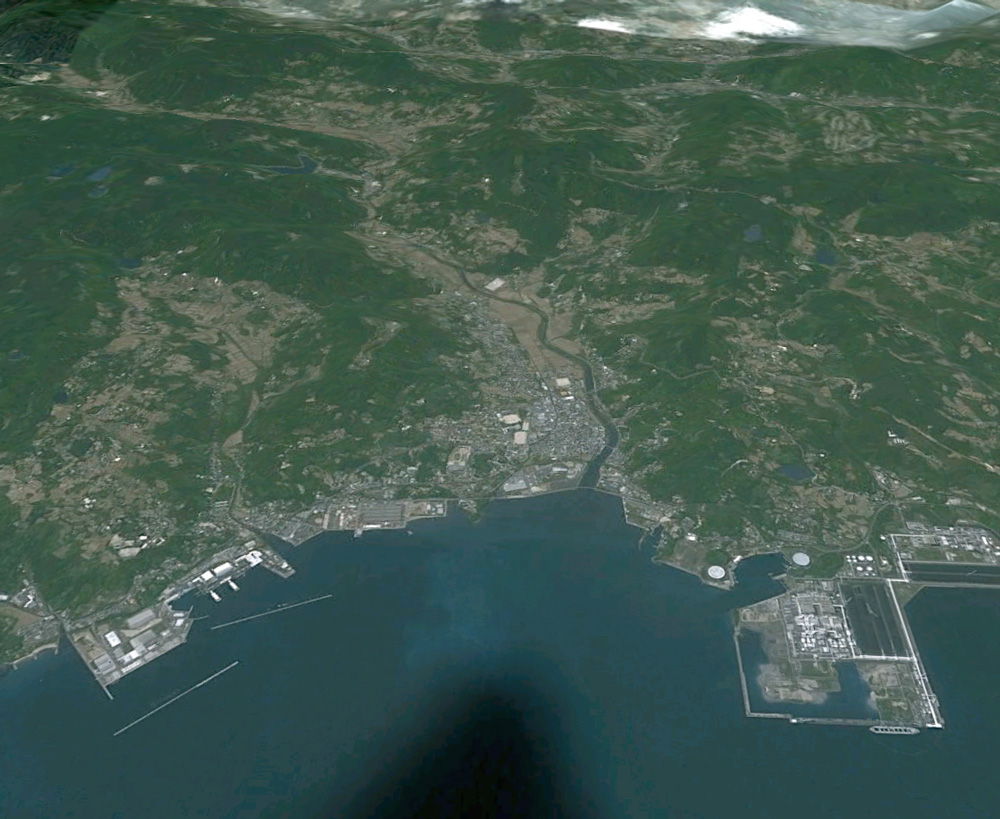 ところが、末盧国に比定される松浦の地形は、海浜の中心に向けて志佐川が流れ、河口付近にデルタが広がっているという特徴があります。そのデルタは住居に適した平野部を提供し、中心を流れる志佐川の両側には、5km以上も細長く、平坦な土地が続いています。その志佐川に沿って、小さな山々が東西双方を1kmほど隔てて続いています。この松浦の地の利を活かすためには、やはりデルタと川沿いの平野をフルに活用するべきであり、古代社会においても例外ではありません。その実態は、航空写真を用いて松浦の地勢に関わる特異性を参照することにより、一目でわかります。つまり、松浦ではデルタ、および海浜沿いに村落を造成することが自然の流れであり、わざわざ内陸の川沿いに並ぶ山裾に沿って居住する理由が見出せないのです。更に、村の周辺が雑草に覆われているという点についても、松浦の地形に比定すると、矛盾が生じてしまいます。なぜならば、松浦は町の中心に志佐川が流れているだけでなく、その川沿いに平野が開かれているため、周辺が雑草に覆われているという閉塞感がないのです。