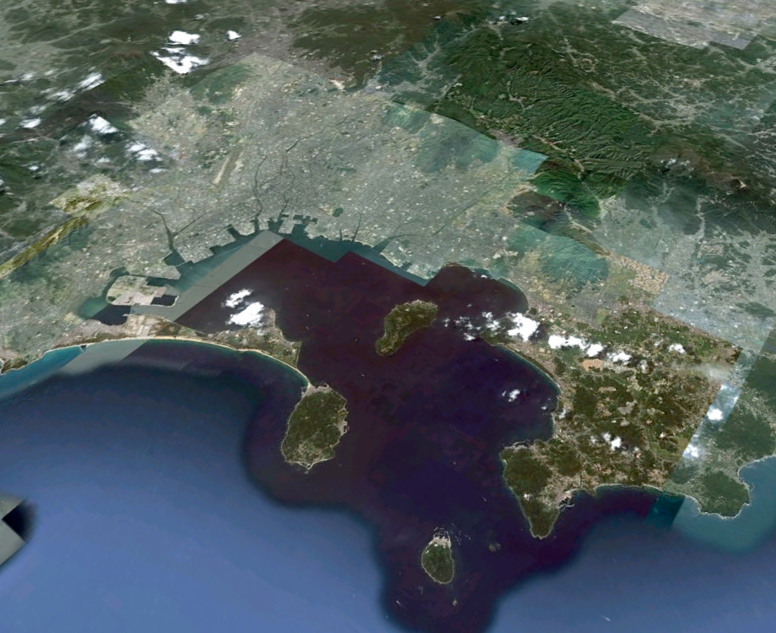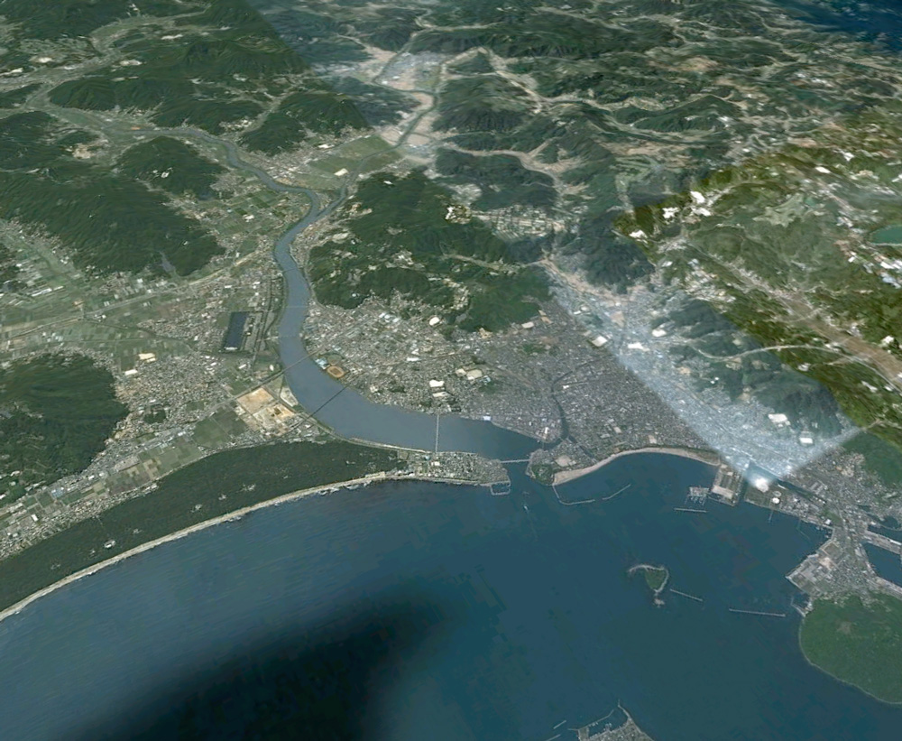 ![]() 川幅の広い松浦川を擁し、 川沿い・海沿いに拾い平野を持つ 唐津 |