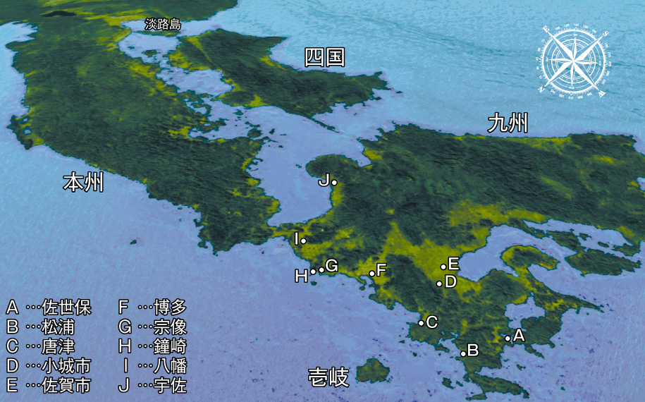東南方向に見る日本列島の姿(3D画像)壱岐から末盧国まで船で渡る航路を想定する際、当然ながら末盧国へ到達した後の行程も視野に入れなければなりません。そこで末盧国の比定地として候補に挙がっている地域から邪馬台国へ至る陸路を、3D画像を辿りながら古代の陸路を想定して探索していくと、すぐに1つの壁にぶつかることに気が付きます。佐賀県や長崎県北部の沿岸周辺には平野部が少なく、内陸側には山地が密集しているため、壱岐からの渡航距離は短いものの、その後の陸路が塞がれている感を否めないのです。つまり九州北部に着岸する港を松浦や唐津、名護屋に想定しても、その後の陸路との繋がりが見えてこないのです。但し、邪馬台国が長崎県や佐賀の山々、もしくはそれらの山々を南に越えた佐賀市や有明海方面に在るという前提ならば検討の余地が残されます。