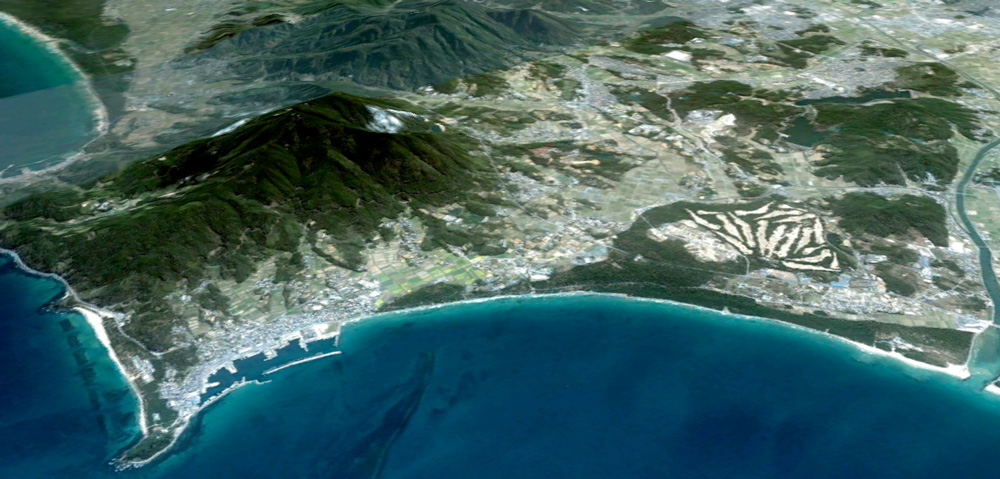 つい先日リリースされたGoogleの3Dマップを用いることにより、地球上のあらゆる場所をピンポイントで見ることができるようになりました。その素晴らしい鮮明度とユーザーインターフェースは世界中で絶賛されています。この3Dマップを活用して、邪馬台国への旅路の対象となる倭国の全体像を把握するため、朝鮮半島の最南端となる巨済島の岬からおよそ、東南方向に眺めた列島の島々を映し出したのが下記の画像です。手前の壱岐から、九州、四国、中国地方、そして淡路島の先の方までが鮮明に映し出されています。島々の位置付けだけでなく、平地部の広がる地域や山岳地帯等、列島の地形が手に取るように分かります。それら地理的要因を踏まえた上で、古代の旅人が果たしてどのようなルートでさまざまな地域を往来していたのか、その道筋を検証するために所々ズームアップして実際の地勢を確かめてみました。