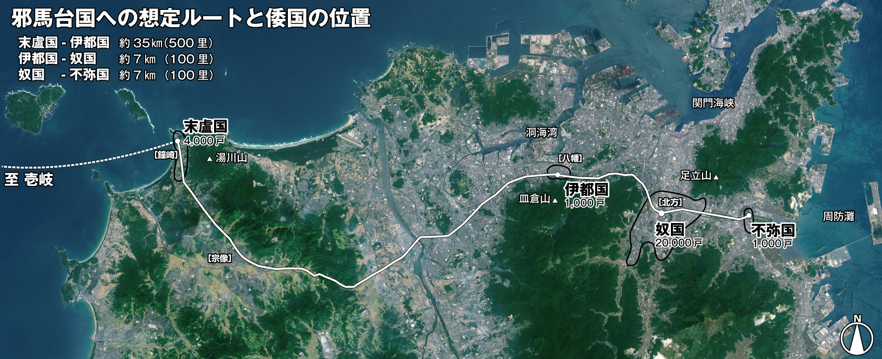 史書の記述より邪馬台国への旅路を辿ると、奴国と呼ばれた古代都市の候補地として、伊都国の比定地である北九州八幡から東南方向7km先にある小倉南区の北方周辺エリアが浮かび上がってきます。奴国は、現在の福岡市付近に存在していたという説が一般的ですが、小倉の北方がピンポイントでその比定地として考えられる理由は、単に史書の記述に準じて伊都国からの位置付けを容易に理解できるだけに止まりません。北方周辺の地域は、2万戸の家屋に相応しい広大な平野地が存在するだけでなく、そこは、九州北部の海岸沿いから東部の海岸へと抜けるための唯一の貴重な陸路が存在し、交差点にあたるエリアだったのです。そして北東に聳え立つ足立山からは、西方には伊都国の比定地である北九州八幡、そして南方向には周防灘の海岸からその内陸にある奴国全体までを一望することができるのです。