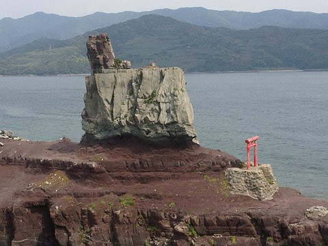 海の要塞 甑大明神の全体像甑島は「コシキ」と読みますが、その名前は続日本紀にも登場し、遅くとも八世紀には「甑」という名前が南九州では使われていたことがわかります。その言葉の意味は米などを蒸すために用いられる、せいろの形に類似した甑形と呼ばれる土器です。その甑形にも見える磐座が島に存在し、甑大明神として地元住民から崇められていたことから、甑島と名前がつけられたと地元では語り継がれています。