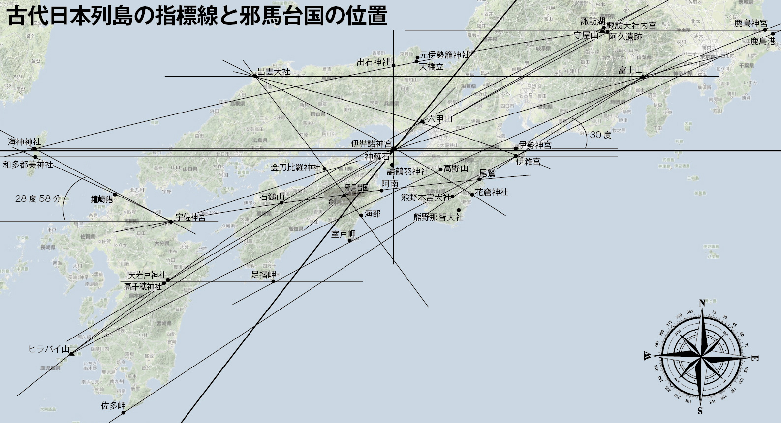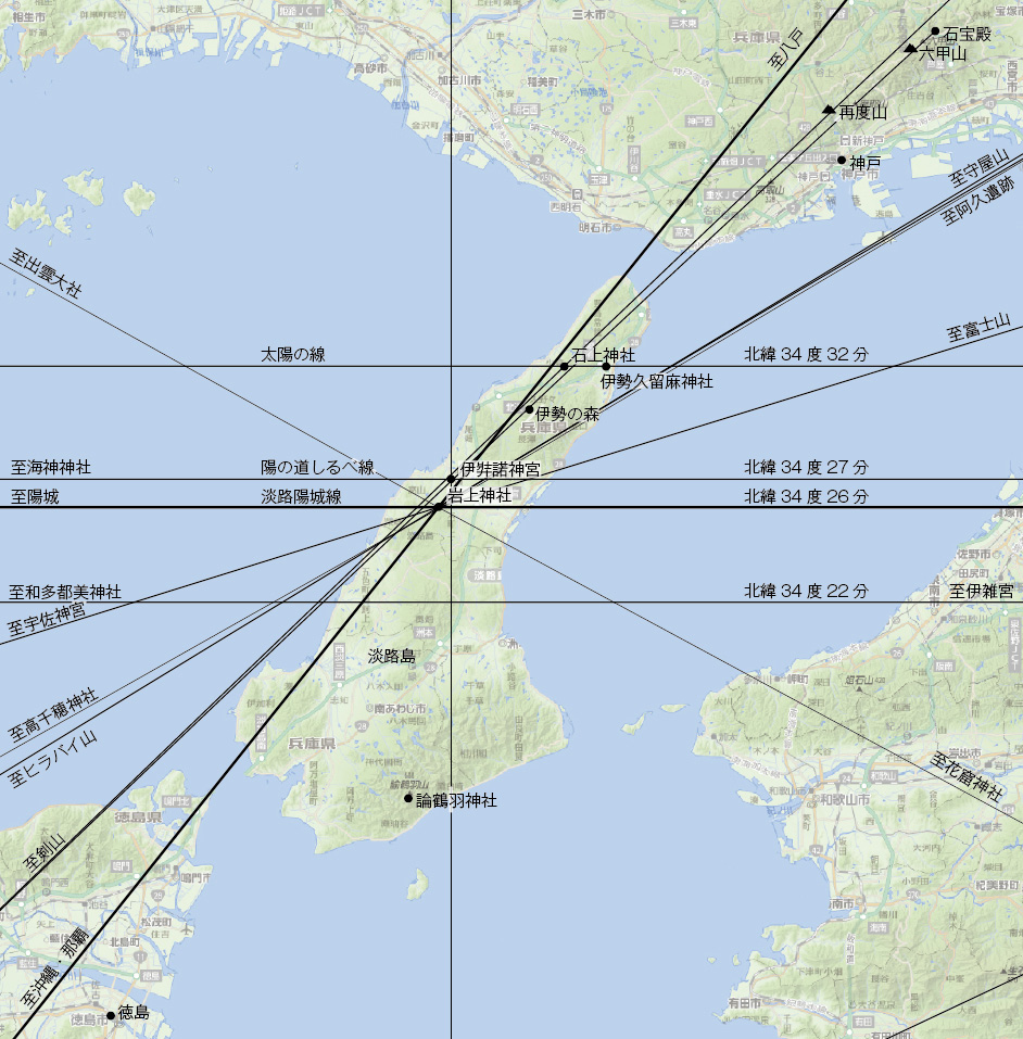 イザヤの一行を始めとするイスラエルからの渡来者にとって、淡路島が「東の島々」の中心として考えられていたことは、これまで確認できた複数の拠点を地図上において結び付けて見てみると、その実態が浮かびあがってくるようです。列島内の拠点を山や湖、岬等の地勢を指標と共に線引きしていくと、その中心に淡路島の神籬石が存在します。そして、それらの拠点同士を異なる角度で結び付けると、その延長線上には新たなる拠点が見えてくるのです。古代の民にとって自然の大地とは神からの賜物であっただけに、土地のロケーションそのものが極めて重要であり、場所同士が太陽の日の出、日の入りの線上に結びつくことや、同緯度上で繋がり、相互に紐づけられていること等が、重要視されていたのです。