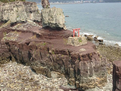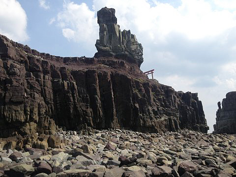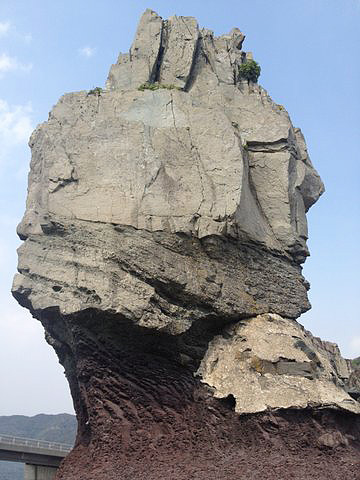 海岸から見上げた甑大明神ところが、実際に甑大明神を検証すると、それは念入りに削られて造られた巨大な磐座の傑作のようです。大明神と呼ばれる磐座の真下、海水に浸かる海辺には、何百、何千とも言える無数の岩石がころがっており、そこには岩を割る為の矢を打ちこんだと思われる跡が無数に見られます。つまり甑大明神とは人工の作品であり、天然の産物ではなかったのです。イスラエルの要塞、マサダを彷彿させる雄姿を持つこの磐座は、正面が沖縄の方向に面し、あたかも南方から渡航してくる同胞を迎える為の指標として創作された感があります。甑大明神とはおそらく、ヒラバイ山の標高が低く、目印としての指標に欠けることから、その場所を明確に指標化するために造られた、古代イスラエルの芸術作品だった可能性を否定できません。