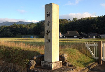 矢田宮そばの神宮新田伊勢市楠部町を県道37号線沿いに東方へと向かい、五十鈴河を渡ると右側に神宮新田が見えてきます。そこから更に500m程先、五十鈴河に繋がる矢田川沿いに口矢田の森へと続く小道があります。神宮新田の東南方向にあたり、御田ノ森とも呼ばれる小高い丘は、今日では随所に雑草が生い茂り、昔の風情を感じることは難しいですが、それでも倭姫命が行幸された大切な場所であることに変わりなく、そこに矢田宮が建立されたのです。