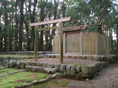 そして次の御巡幸地である佐々牟江宮にて短期間滞在した後、伊蘇宮と瀧原宮に向けて伊勢湾から宮川を上流へと上り始めた際、どこからともなく現れた天照大神が倭姫命に、「神風の伊勢国は、即ち常世の浪の重浪帰する国なり…是の国に居らむ欲す」と告げられます。倭姫命は改めて、伊勢国が最終の鎮座地であることを確認し、御巡幸の旅は続けられたのです。そして最終的に倭姫命は、元伊勢御巡幸の最終地点、五十鈴河上流に斎宮と伊勢皇大神宮を建てることとなります。「その祠を建てたまう。因りて斎宮を五十鈴河上に興し立つ。是を礒宮と謂う。天照太神始めて天自り降ります所也。」と「世記」に書かれているとおりです。礒宮とは伊勢皇大神宮の古名です。この倭姫命世記に含まれる伊勢神宮の成り立ちに関わる分注は垂仁記25年3月10日条文と同一であり、天照大神の御神託に従って倭姫命が五十鈴宮を建立されたという歴史の結末を知らしめるために、垂仁記からそのまま引用されています。