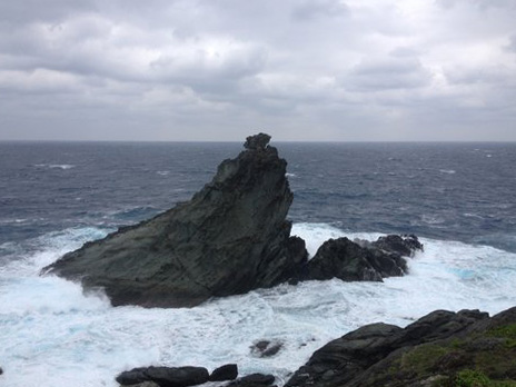 嵐の中に立つ御神崎の雄姿唯一の例外が石垣島です。その北西部には、誰もが目を引きつけられる巨石が海岸沿いに聳え立っています。それが御神崎の磐座です。一見、自然に浸食した巨石が海中から立ち上がっているように見えますが、背後から見るその容姿は孔雀が羽を広げているようにも見えます。また、北東を向く正面部分は岩が切り落とされたような絶壁の様相となっており、もしかしたら人為的に岩が切り落とされたのかもしれません。御神崎という名称は、ヘブライ語でアンカー、碇、支えを意味する