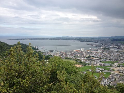 日峰山から和田島と遠くに伊島を見る頂上周辺では神が祀られました。標高は191mとさほど高くはありませんが、その頂上からの景色は実に素晴らしく、真北には吉野川の広大なデルタが広がり、北東方向には淡路島を一望することができます。そして東方には紀伊水道を越えて和歌山とその背後に聳え立つ吉野や熊野の山々を目にすることができ、東南方向には和田島と伊島を眺めることができます。そして西側には阿波の山々が見渡せ、その背後に四国の霊峰、剣山が聳え立っています。国生みの原点となる指標の島としては、正に絶好の場所に位置していたのです。