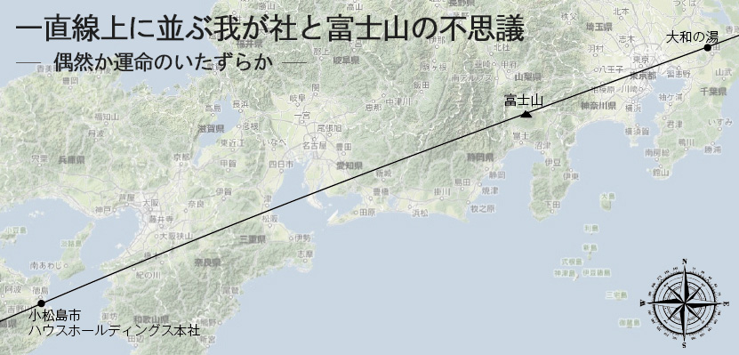 レイラインに纏わる興味深い体験談を一つ紹介します。2014年に、筆者が経営に関わる会社の本社を、千葉県成田市から徳島県小松島市に移転することになりました。徳島で本社移転の場所を探している最中、たまたま安価に取得できる物件が、願ってもない海沿いに見つかったのです。そして本社移転の手続きが完了したある時、ふと気になり、小松島市の新社屋がレイライン上でどこに結び付いているか、地図で確認することにしました。すると驚いたことに、小松島の本社と富士山の山頂を結ぶ延長線上に、成田の下総松崎にある「大和の湯」という天然温泉の存在が確認できたのです。「大和の湯」と言えば、筆者が関与する事業の中でも、成田で最初に立ち上げた温浴施設であり、今日でも自社の重要な位置を占めています。その「大和の湯」が小松島の本社と富士山の山頂を介して一直線に連なっているということは、単なる偶然として片づけるべきでしょうか。それとも運命のいたずらというべきものなのでしょうか。