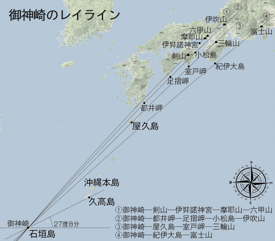 日峰山は、八重山諸島、石垣島にある御神崎ともレイライン上で結び付いています。数多く存在する日本列島のレイラインの中でも、最も古い歴史を持つ基点の一つである石垣島の御神崎を通るレイラインは4本存在し、それぞれが富士山や剣山、伊吹山など、古代から知られる霊峰の頂上を通り抜けています。中でも重要なのは、御神崎から北東方向へ41度18分の方角に真っすぐ進み、宮崎の都井岬から足摺岬を通り抜け、琵琶湖そばの霊峰、伊吹山の頂上に当たるレイラインです。何故なら、この線上に小松島の日峰山が存在するからです。