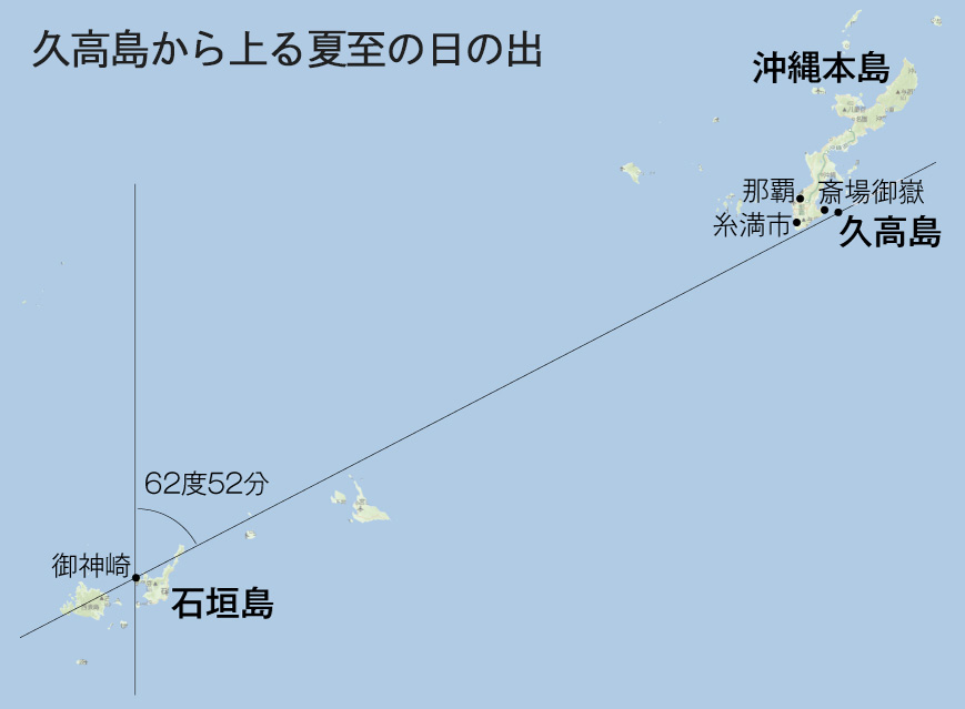 久高島から上る夏至の日の出御神崎から夏至の日の出が見える方角は、およそ63度です。実際に、そこから62度52分の方角へ向かって真っすぐに旅をすると、沖縄本島の最南端、糸満市の海岸近くを通り、斎場遺跡から5㎞少々東方に位置する久高島に辿り着きます。「神の島」とも呼ばれる久高島は、島全体が聖域化された神聖な島です。つまり、夏至の日に石垣島の御神崎から日の出の太陽を拝することは、同時に「神の島」も拝することを意味したのです。こうして八重山諸島の御神崎と「神の島」久高島は、夏至の太陽によって地理的に結び付けられ、聖地化されることになります。また、御神崎は旅の基点として久高島とだけでなく、他に少なくとも4本の重要なレイラインを構成しています。その線上には富士山、三輪山、伊吹山、六甲山など、古代から崇拝されてきた霊峰や、室戸岬、足摺岬などの地勢際立つ岬が並び、その中に日峰山がある小松島も含まれています。国生みの時代では、これら御神崎に結び付く地の指標が、列島内の拠点を定めていく上で用いられることになりました。