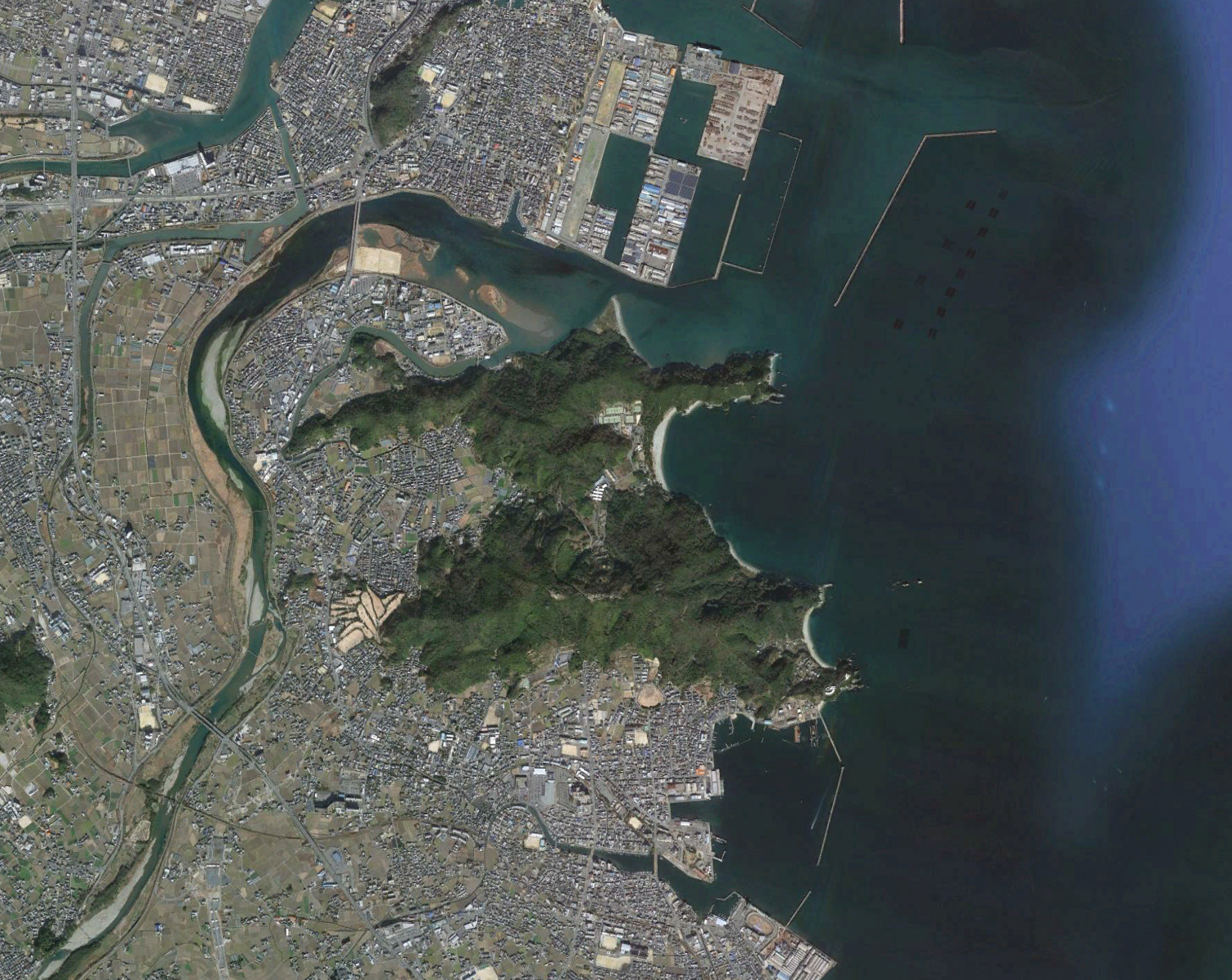 驚くことに、著名な山々や岬などが一直線上に結び付くレイラインが複数存在し、それらが交差する場所が淡路島のそばに存在することを、今日でも地図上で確認することができます。それが徳島県小松島の日峰山です。今日、日峰山の東には海が広がり、北側は勝浦川の河口にあたるものの、西側と南側には平地が広がり、市街化が進んでいます。しかしながら古代では、これらの平地は湿地帯であり、それ故、日峰山は小松島というおよそ湿地帯に囲まれた海の中に浮かぶ島の中心だったのです。日峰山は古代から旅の指標として重要視され、