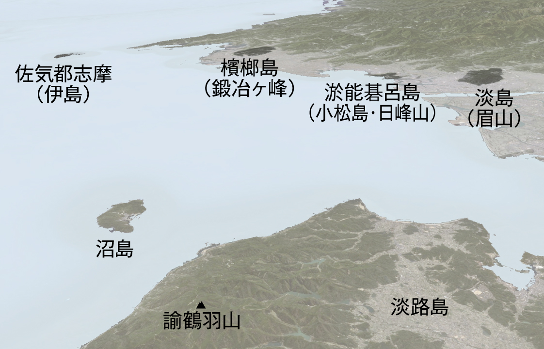 4つの島その読みを現代の書き方に直すと、「我が国見れば 淡島 オノゴロ島、檳榔(アジマサ)島も見ゆ 離つ(さけつ)島見ゆ」、となります。難波の岬から旅立ち、淡路島の高台から国土を展望した仁徳天皇が目にしたのは、淡島とオノゴロ島、檳榔の島、そして佐気都島という4つの島でした。淡路島から見ることのできる島々は、紀伊水道の伊島より北方に限られることから、どの島も淡路島からの距離はさほど遠くはなかったと考えられます。