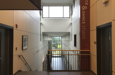 ダンススタジオと劇団用のステージを備えたビルスポーツに限らず、アーティストの育成にも熱心であり、劇団に関わるプログラムも多彩です。校内には舞台芸術に関わる12のグループが存在します。それらのグループをサポートするために、劇団アート専用の建物の中に、各種ステージ施設やトレーニング場、ダンスレッスン場などが設けられています。こうして練習を積み重ねた学生は、年間を通じて50回ものパフォーマンスやショーを繰り広げています。