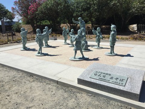 二十四の瞳村の「せんせあそぼ」像その「二十四の瞳」の映画化を記念して、小豆島には「二十四の瞳映画村」が開設されました。実際に映画のロケが行われた田浦地区の海岸沿いにある、およそ1万平方メートルの敷地に建築されたロケ用の施設を改築し、映画村として一般に公開されたのです。そこには木造の校舎や茶屋、漁師の家などが佇み、ちょっとした自然公園のような趣があります。瀬戸内海を見渡せることから、誰でも都会の雑踏から逃れて、ほっとしたひと時を過ごすことができるのではないでしょうか。そのような「時間が止まる」空間が、今日の小豆島には残されています。