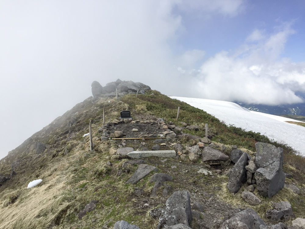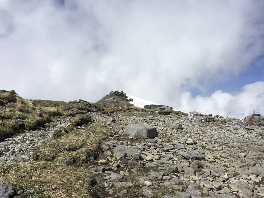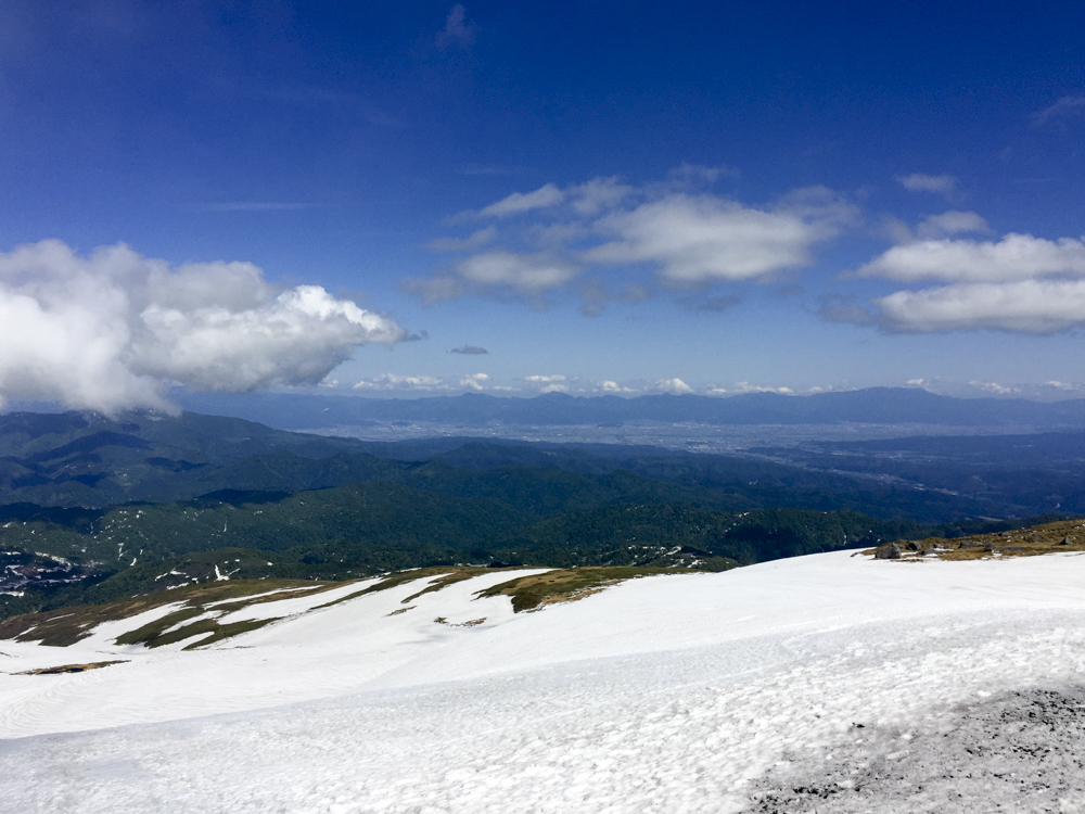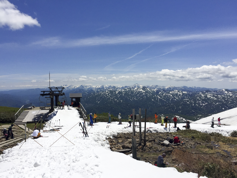 雪で塞がれた月山のスキー場に到達!登山にはサプライズがつきものです。6月初旬の月山は、正にその象徴と言えるでしょう。想定外だったことに、まだ、月山はスキーシーズンの真っただ中でした。当日も多くのスキーヤーが平日だというのに、スノボやスキーをゲレンデにて楽しんでいたのです。思いもよらず、雪が積もっている月山の姿と多くのスキーヤーを目の当たりにし、準備不足の自分にあきれ返ってしまいました。自らの姿を振り返ると、短パンとシャツ1枚、ランニング用のベストという軽装です。しかも最悪なことに足首下までのトレッキングシューズしか履いておらず、小さいリュックにはウインドブレーカー1着しか入っていません。そんな夏山トレッキング姿の自分が、ひとり手ぶらで月山のスキー場に立っていたのです。
