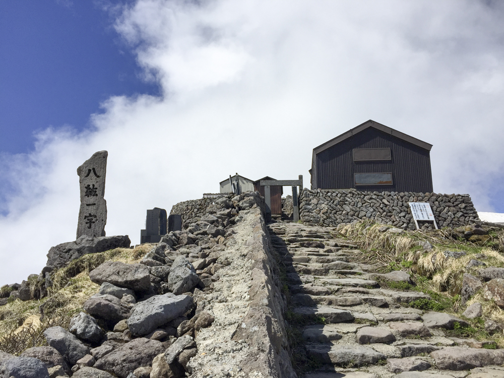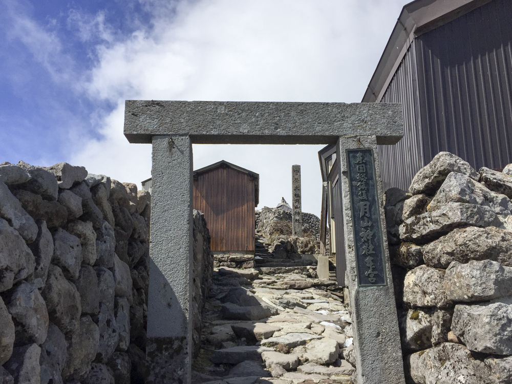 1時間ほどノンストップで歩き続けたでしょうか。頂上に近づいてくると雪が溶けて草木だけの箇所が多くなり、そちらを歩いてみようとチャレンジするも、生い茂る草木の背丈が高く、それを掻き分けて歩くことはむしろもっと難しく感じられたことから、結局、雪の上を歩くことにしました。そして暫くすると、雪が溶けている箇所に石の階段が見えてきたのです。その階段を上っていくと、そこから更に長い石段が続き、その先にある頂上の神社が目に入りました。不思議と頂上周辺にはまったく雪は残っていません。そして月山神社までの最後の石段は、きれいに一直線に敷かれ、参道の様相を呈していたのです。