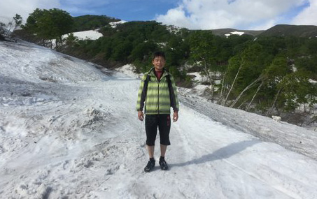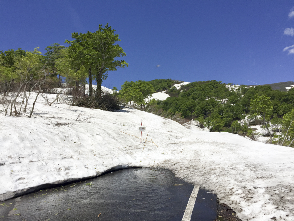 雪で通行止めになっている月山への道路湯殿山を出発し、ナビを頼りに車を運転して月山へ向かう途中、びっくり仰天!何とナビに表記されている月山への道が、途中で雪のために閉鎖されているのです。6月初旬で雪道?ふと、不安が脳裏を横切ります。平日であったことから、すぐに山形県鶴岡市の役所に電話して月山への道のりを聞くも、なかなか答えをもらうことができずに、焦りがつのります。最終的に道路課の方と話をさせて頂き、とにかく月山スキー場への道へと迂回するのが一番確実であることを教えてもらいました。スキー上のリフトもまだ動いている、というのです。30分ほどの時間ロスはあったでしょうか、その後、月山のスキー場に到着した時、時計は既に12時半を回っていました。空港へ出発するカウントダウンまで、残り5時間少々です。