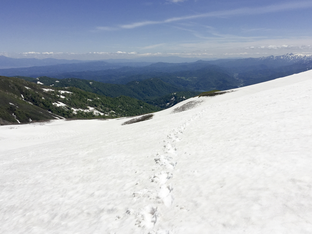 自らの足跡だけが残る寂しい雪山しかしどこまで歩いても、なかなか月山山頂は見えてきません。そして振り返ると、自分が歩んできた足跡が、雪の中にずっと続いているのが遠くまで見えます。その向こうには素晴らし景色と青空が広がっているのですが、それを楽しむゆとりは、もはやありません。雪山の徒歩は思ったよりもペースが遅く、足の負担も大きく、だんだんと時間が気になってきました。その上、紫外線によって目が段々と痛くなってきました。無論、細目だけで見るようにして、目を大きく開けることはないのですが、それでも、眼球がやられてしまうのでしょう。目は痛い、手も氷に切られてひりひりするし、足にも疲労がたまってきます。これでは、まさに八甲田山の行進のようなものです。