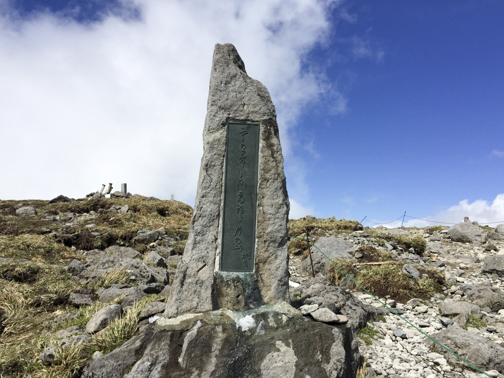 午後2時15分、「八紘一宇」の文字が大きく刻まれた石碑が建てられている月山神社本宮に辿り着きました。そこが、月山の山頂です。オフシーズンということで、人影もなく、自分一人が頂上に立ち、月山を独り占めしているという貴重な時間です。境内の中は小規模ですが、神を祀り、祈るために設けられた聖なる場として、重厚な雰囲気が漂います。そこで一人ながら感謝の祈りを神に捧げました。周辺の景色も素晴らしく、登頂の達成感を思う存分体験でき、まさに至福のひと時を過ごしました。ここまで頑張ってきたかいがあったと、ちょっとばかり自分が誇らしくも思えました。