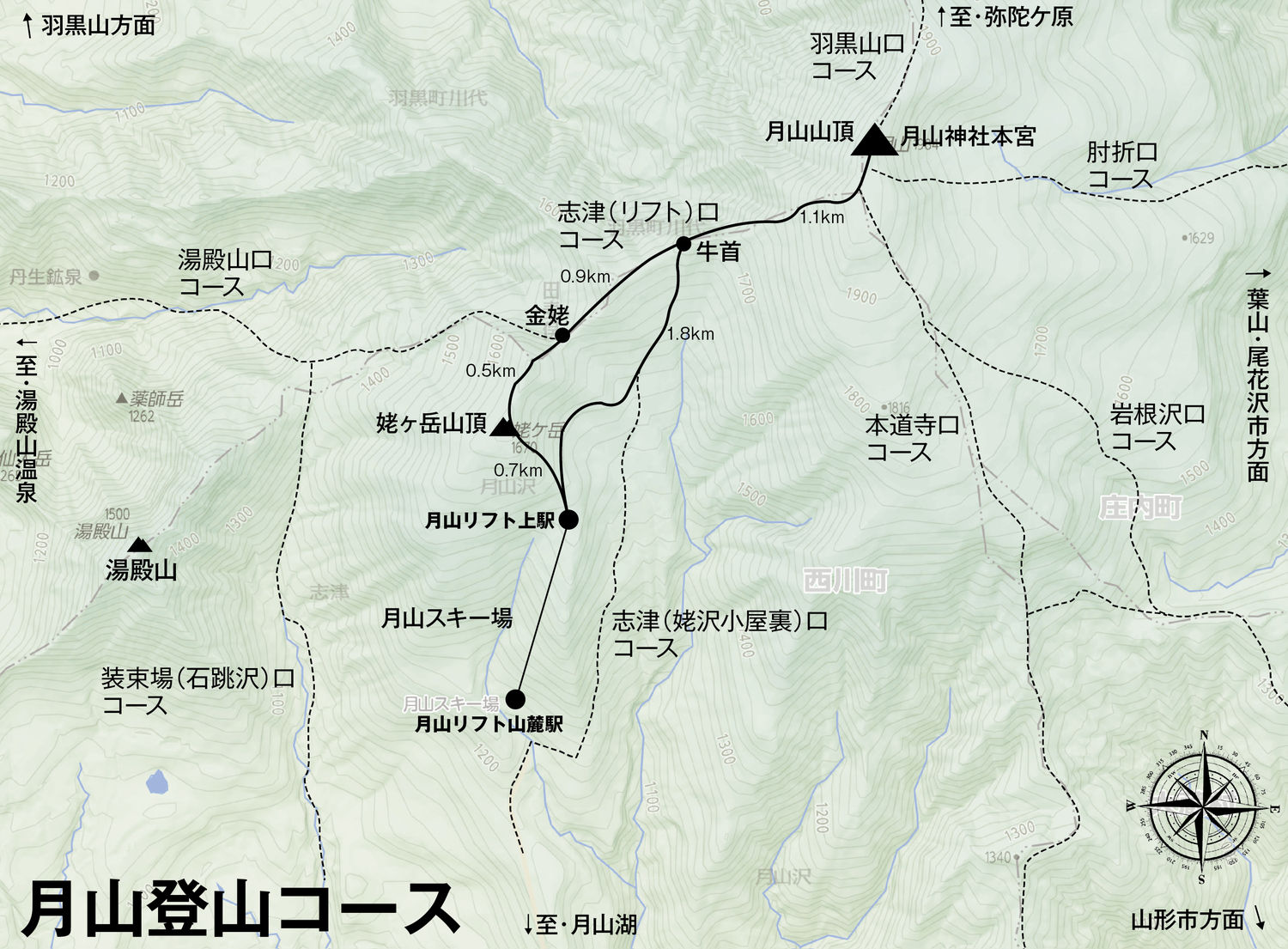 志津口(リフト)コース標高差図そこから標高1505mのリフト上駅までスキーリフトに乗って移動します。リフトの終点からは、月山山頂までのおよそ3.7㎞、標高差479mを、2時間少々歩きながら登って行くことになります。その途中、「牛首」と呼ばれる峰を通り抜けます。月山全体は遠くから望むと牛が伏せているような形に見え、その場所がちょうど「牛の首」の辺りに当たることから、「牛首」という地名がついたといわれています。