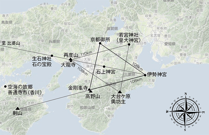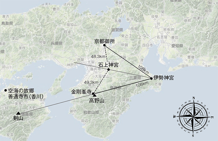 伊勢神宮 風日祈宮さっそく108㎞という距離に注視しながら、伊勢神宮から同じ距離を持つ聖地が他にも存在しないか地図上で検証してみました。もし、108㎞離れた場所に大切な聖地が存在するならば、伊勢神宮から剣山に向けて同距離を持つ場所に新しい聖地を見出すことにより、これらの聖地がすべて仮想線上に繋がる関係になると推測したのです。そこで伊勢神宮から弧を描くように紀伊半島の西方から北方に向けて108㎞離れた地点を見渡すと、北西方向に京都御所を見つけました。しかもグーグルマップの距離をみると、ピタリ、108㎞となっていたのです!これは高野山が伊勢神宮と御所、すなわち日本国天皇がお住まいになられる聖地と密着するだけでなく、しかも剣山との繋がりも持つことを目論んだ結果ではないかと、とっさに思いました。空海の父方は皇族との繋がりが深く、空海も10代の頃から奈良に出入りし、勉学に励んできました。また、京都の地を見出して天皇に進言をした和気清麻呂とも大変親しい仲にあったことから、空海にとって天皇が住まわれる京都は大切な聖地であったに違いありません。よって、伊勢神宮と剣山を結ぶ線上において、京都と伊勢の距離と同じ108㎞の地点を、空海の生涯を全うする高野山の聖地としたのでしょう。