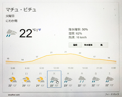 マチュピチュへ行く当日はにわか雨の予報一番気を使ったのは、天候です。というのも2月はマチュピチュの雨季にあたり、連日雨が降るようです。せっかく地球の裏側まで行っても、雨に降られて写真さえまともに撮ることができなければ、ショックは隠せません。よって長期天気予報と睨めっこしながらマチュピチュに行く日取りを決めようとするも、毎日が曇り時々雨のようなので、こればかりは運を天に任すことにしました。そして到着後はクスコに宿泊し、周辺のインカ遺跡を見学した後、旅の後半でマチュピチュを訪ねることにしたのです。