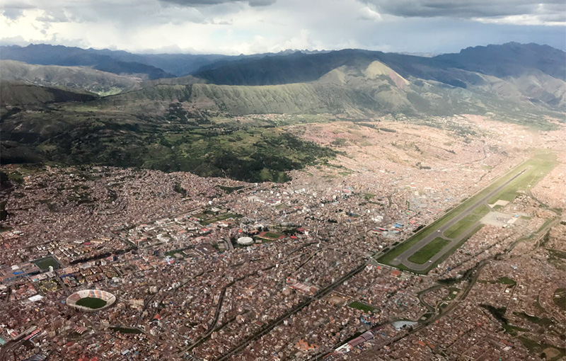 クスコに到着1月27日、コスタリカを経由して夕方4時に南米ペルーのクスコに到着しました。飛行機のタラップをおりて地面を踏むと、そこはペルーの高地。周辺の山並みがきれいに見えます。そして小ぶりな空港ビル内に入り、廊下を歩いていたその時、突如、ぐらっと足がふらつき、頭がぼーっとしてきました。とっさに富士山で高山病になったことを思いだしました。そして遅ればせながら、クスコは標高3400mの高地にあり、3776mある富士山の頂上とさほど変わらないことを思い出しました。でも意識はしっかりとして、体も動いていたことから、大丈夫だろうと自分に言い聞かせ、タクシーに乗りました。