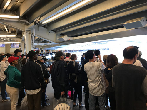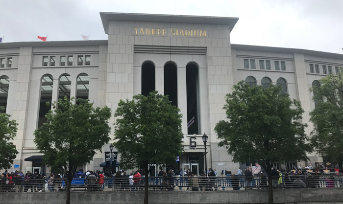 空港について心配したことは、雨が強く降っていたことです。天気予報では、午前中は雨。そして午後からは小雨でした。雨の中で野球は見たくない、というのが本音です。野球が始まる時間までには、何とか天気にならないかと願いつつ、JFK空港からヤンキースタジアムまで、タクシーで向かいました。日曜ということで渋滞もなく、65ドルという料金ですぐにスタジアム横の売店街に到着です。まず最初にしなければならないことは、旅行の荷物を預ける場所を探すことです。