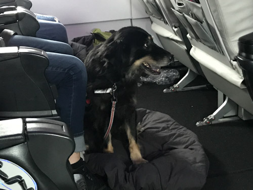 飛行機の中に大きい犬がいるなんて!渡米してから2日目、時差ボケの真っただ中ですが、疲労も蓄積していたことから、「ぐた。。」と寝てしまいました。そしてふと気が付くと、何と、横の席には大きなワンちゃんがいるではないですか。そうなんです。ここ最近、アメリカの飛行機にはマイペットの犬を一緒に搭乗させてOKとなり、時折いるんです。大きい犬も。日本ではありえませんよね。飛行機の床に犬が寝っ転がっているなんて!そしてすぐに、後30分でジョン・F・ケネディー空港に到着します、というアナウンスが流れました。