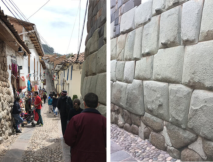 12角の石 多くの人でにぎわう次に、「12角の石」へと足を運びました。ここもホテルから150mほどの距離であり、石畳みの道を歩くと、すぐに人だかりが見えてきました。インカ帝国時代の石造技術の素晴らしさを目の当たりにできる石垣は、大小様々な石が見事に12角に切り出され、ぴたりと噛み合うように隙間なく組み立てられています。「12角の石」には手をかざすだけで太陽のエネルギーを得ることができるという伝承もあることから、パワースポットとしても名高く、多くの人々が石壁の傍らにたたずみ、手をかざしたり触ったりしています。近郊には14角の石もあり、ツーリストの目を楽しませてくれます。