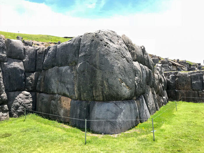 サクサイワマンの3段積の城壁そのサクサイワマン遺跡に一歩足を踏み入れると、そこは正に別世界でした。入口のゲートと案内板が立てられているエリアを通り抜けると、突如、広大な遺跡が目に入ります。野球場よりもずっと広い自然公園のような巨大な広場の右側には、巨石群のモニュメントが連なっています。それらの巨石は巧みに3段に積み重ねられ、その高さは6-7mにもなり、最大では9mにも及びます。建造当初は高さが20m近くもあったと言われ、スペイン軍との戦いの後、建造物の資源となるべく破壊された跡が今日、残されているようです。それらの巨石は防壁塀として使われていたかのようにギザギザに並べられ、およそ350mにわたり東西に広がっている景観は、まさにこの場所が要塞であったことを物語っています。また、サクサイワマンにはかつて、東西に並ぶ3つの塔が建てられていたと考えられています。重さが100トンを優に超えるような巨石が、きちんとつなぎ目を合わせて隙間なく組み立てられていることに驚きを隠せません。これらの巨石がどのように運ばれて積み重ねられたかは、今日まで謎となっています。