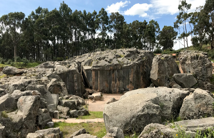 放射線状に繋がるサクサイワマンの祭祀場昨今の周辺の発掘調査からは、巨石からなる壁の内側には神殿や様々な施設が建てられていたことがわかり、サクサイワマン全体が宗教的な意味あいのある施設であったと推測されています。その背景には太陽信仰があり、サクサイワマン内にあるQ'ochaと呼ばれる大きな円形状の広場や放射線状に広がる場所も、宗教的な儀式を行うための祭祀場となるコロシアムであったと考えられています。その円形の祭祀場のような広場は、不思議と崇拝する方向がイスラエルのエルサレムが位置する北東を指しています。
