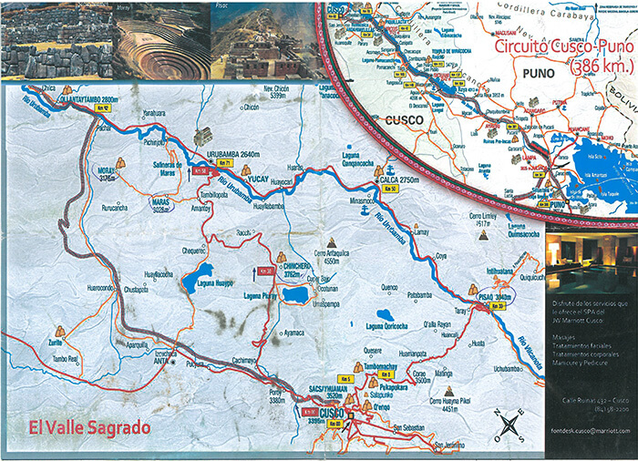 クスコ遺跡マップそれにしても、1日しかクスコ周辺の遺跡を見る時間がないというプランは変わらず、どうやって全部の遺跡を見ることができるのか、不安が残ります。JWマリオットホテルのコンシェルジュから言われたことは、クスコ周辺の遺跡については距離も近いことから、行先を決めてタクシーで行くか、もしくは1日がかりのグループツアーを使うのが良いということでした。クスコ周辺の遺跡ツアーには、タクシーを使って巡ることが普通のようです。しかしながら地図を見る限り、クスコ周辺の遺跡までの距離は市街から半径5~6㎞圏内にあり、さほど遠くはないように思えたことから、当初はジョギングも兼ねて自分の足で走って回り、見学することを考えていました。しかしクスコに到着後、近辺の道路事情を目の当たりにしてからは考えが一変!街中は渋滞が多く、道路も埃がたちあがり、坂道が多く、しかも高地ということで軽い高山病にかかっているような体調を否めず、走って回るのは断念しました。