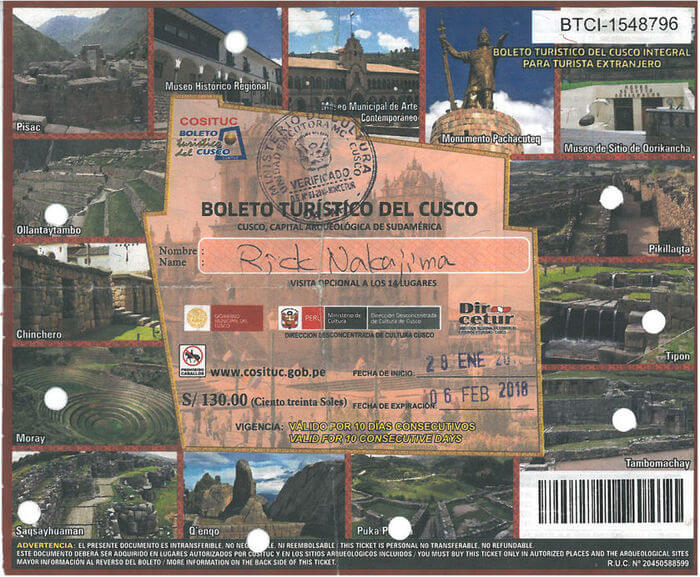 クスコ市発行の周遊チケットやっとのことで探しあてたチケット売り場で聞いてみると、周遊券には4種類あることがわかりました。16か所全部の遺跡や博物館をみるフルチケットと、4~8か所を見ることができるものが3種類、合わせて4種類あります。部分的に観光するチケットは、「サクサイワマン」を含むクスコ周辺の施設4か所のチケット、クスコとセイクレッド・バレー(聖なる谷)の遺跡を中心とする8か所のチケット、そしてセイクレッド・バレー4施設からなるチケットがあります。そしてフルチケットに含まれている遺跡名のリストを見ると、翌日、オリャンタイタンボに向けて移動する途中に観たいと思っていたMorayやマラス塩田などの著名な遺跡がほとんど含まれていたことから、即決でフルチケットを購入しました。価格はおよそUS47ドル。日本円に換算すると5500円程度なので、悪くありません!部分的に見るパートのチケットはどれも$25することから、せっかくですからフルチケットを購入して、全部見てしまおうと思いました。フルチケットには、ペルー国の文化庁が推奨する16か所の遺跡や施設の名称が記されています。それらひとつ一つの遺跡をチケットで確認しながら、これから自分が歩もうとしているツアー目的地の場所など、内容を少しずつ理解することができました。チケットに関しては9歳以下は無料、学生ディスカウントもあるので、家族連れや若者には朗報です。