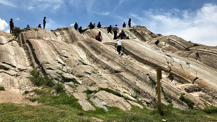 そして広場を歩いて渡ると、その先には天然の岩が滑り台のように曲線の形を描いたSUCHUNAと呼ばれる岩場があります。その岩盤の表面はつるつるに光っており、うっかりすると転んでしまうほど滑らかです。実際にサクサイワマンを訪れる多くの観光客は、この岩を滑り台のように使って滑り降りながら遊んでいます。SUCHUNAはインカの時代、その裏側にある貯水所に雨水を流し込むために使われていたのではないかと考えられています。その他、遺跡東方の岩地にはCHINKANAと呼ばれるトンネルがあり、大きな岩場が迷路のように組み合わされたような形相をかもしだしています。その周辺には岩の一部を切って加工した椅子状の巨石も多くみられ、僧侶や王室用の椅子であったという説もあります。遺跡の南側、高台には1945年、リオデジャネイロにあるキリスト像のレプリカが建てられています。高さが約8mもあることから、クスコからも見ることのできる街のシンボルとなっています。