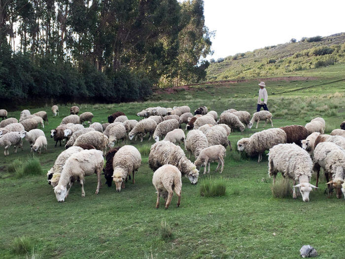 羊の群れに遭遇タンボマチャイには裏山が広がっており、せっかくここまできたので、誰もいない裏山に一人で登って散策することにしました。そして30分くらい歩き続けていると、何とそこで、羊飼いに導かれた羊の大群に遭遇したのです。タンボマチャイを探索するというインカ遺跡の旅で、まさか羊に囲まれるとは思いもせず、大変貴重な体験ができました。羊は近寄っても逃げることもせず、羊飼いの導きにゆっくりと従っていました。なんと優雅な光景だろうか、と感動もひとしおでした。