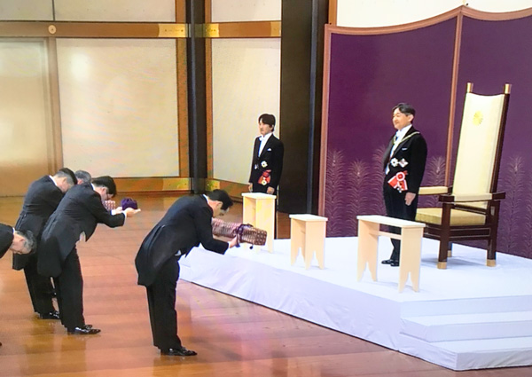 その翌日、5月1日午前0時、新たに天皇陛下が即位され、令和の時代が幕を開けました。新天皇は一見お若くお見えになられますが、お歳は既に59歳になっておられ、歴代天皇の中では奈良時代の光仁天皇に次ぎ、過去に即位された天皇の中では2番目に高齢です。午前10時半からは「剣璽等承継の儀」が行われ、歴代天皇に承継されてきた神器が、天皇に受け継がれました。それら神器の中には「三種の神器」のうち、剣と勾玉が含まれ、同時に公務において使う印章の御璽と国璽も引き継がれました。