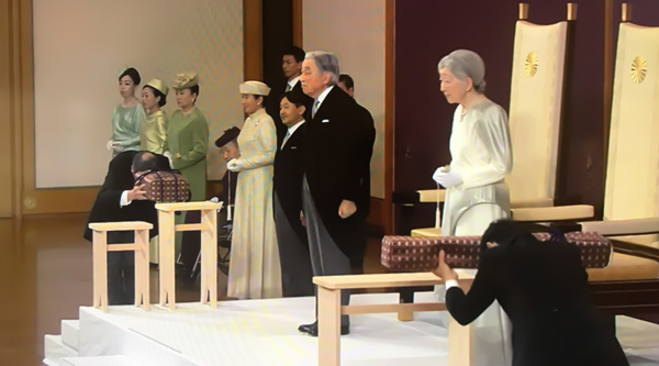同日の午後5時、退位が国民に告げられ、天皇陛下が国民の代表者らと退位前、最後にお会いするための「退位礼正殿の儀」が、宮殿松の間にて執り行われました。そこでは安倍内閣総理大臣が国民を代表して天皇陛下にお礼を述べ伝え、その後、天皇陛下が国民に対して最後のお言葉を述べられ、これが皇居における憲政史上初めての退位の儀式となりました。